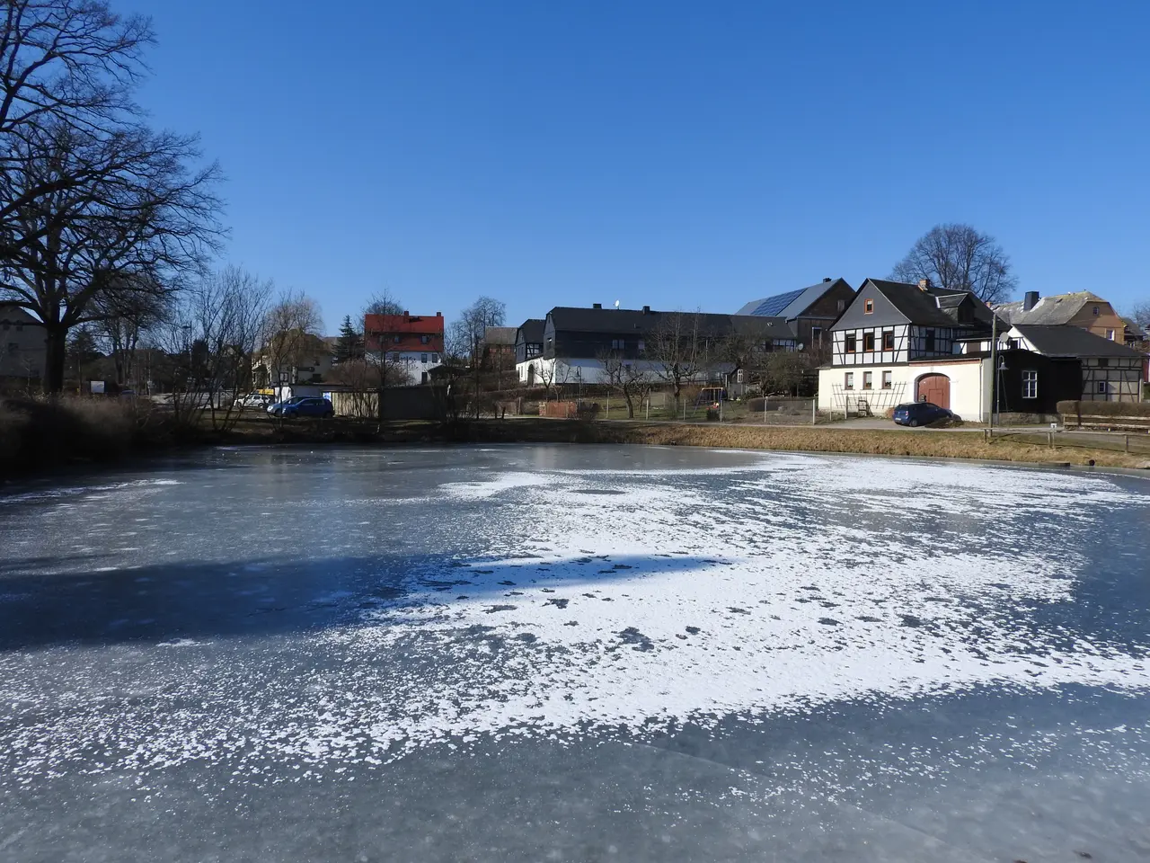 A Ford veered off the road and landed on a frozen pond in the Upper Palatinate region on Sunday. The incident took place near Bodenwöhr, where emergency services quickly arrived at the scene. Both occupants escaped without serious injury by walking across the ice to safety.
