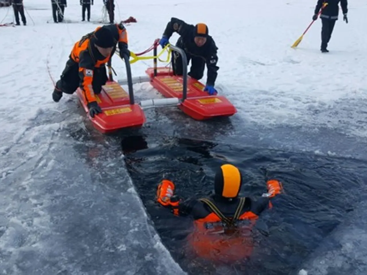 During emergencies, divers secure themselves with safety lines before searching underwater. Once a victim is found, they are pulled to shore and wrapped in warm blankets. Rescuers then gradually warm them with tea—never alcohol—since the body loses heat and mobility rapidly in icy water.